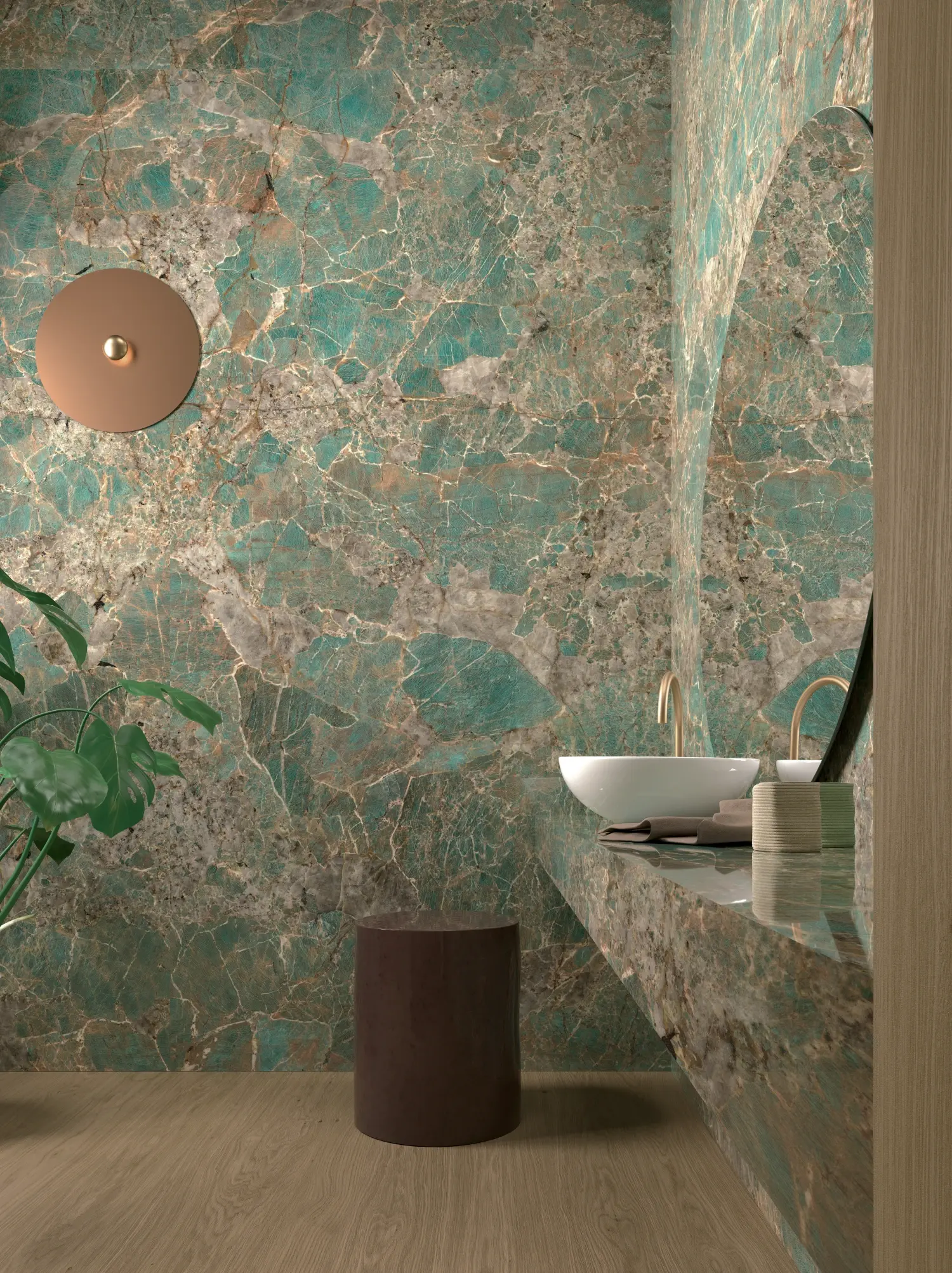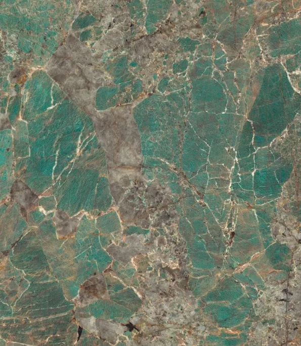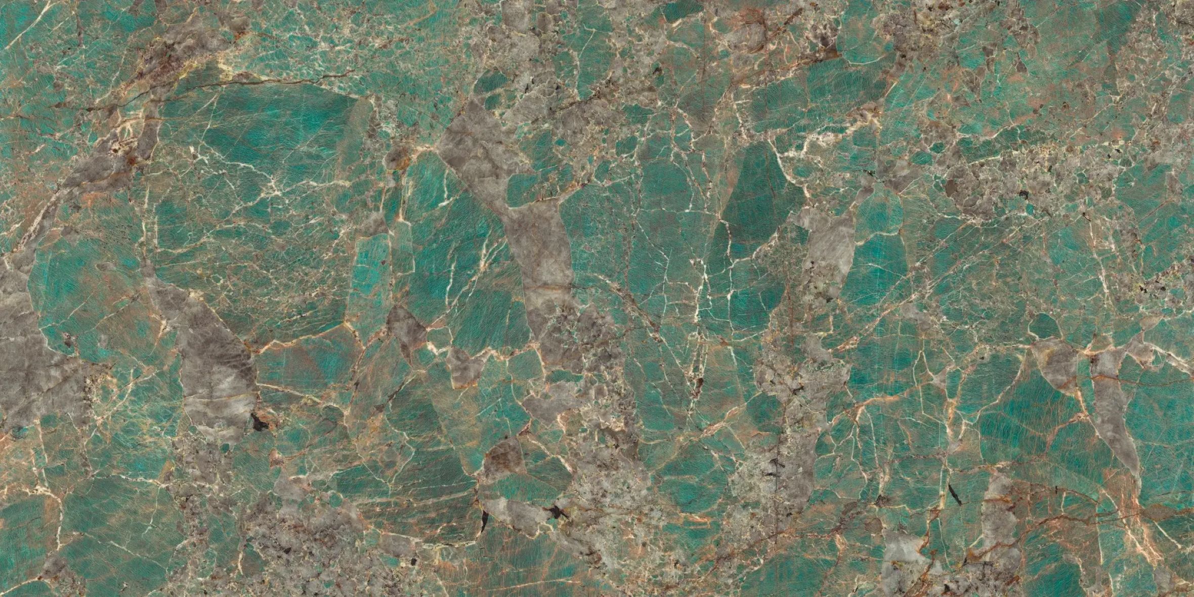 dazzling turquoise hue bathed in a texture of brownish tones and greyish incursions.