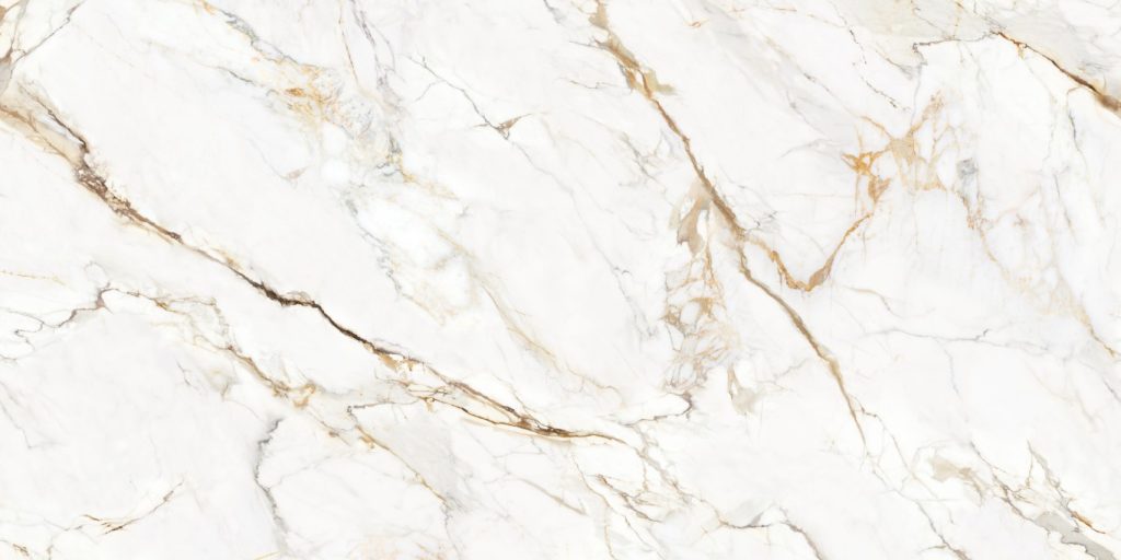 Calacatta Mystic shows a luminous surface with a smooth, refined base, animated by sweeping mineral lines that drift diagonally across the slab. Warm metallic accents thread through finer fractures, while broader, softer markings add movement and depth. The overall effect feels elegant and fluid, with a balanced mix of bold expression and delicate detail.