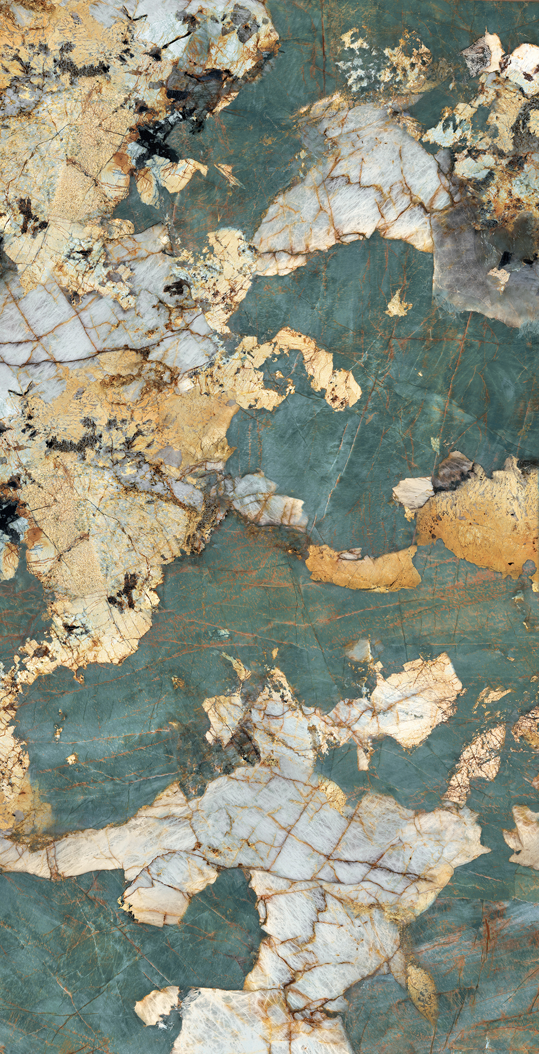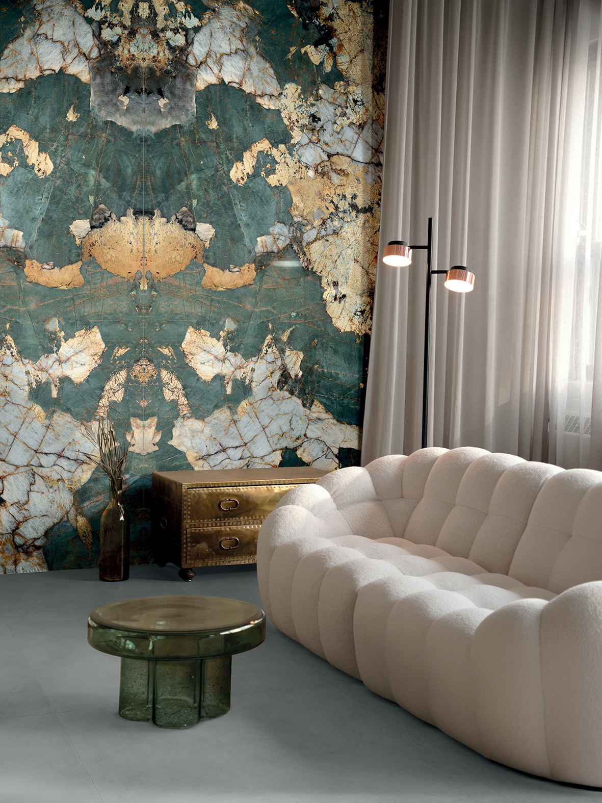 Emerald Gold is a statement material, suited to interiors where the surface itself is intended to stand out. The interplay of green, white and gold gives it a luxurious, architectural presence that responds beautifully to natural and artificial light.
