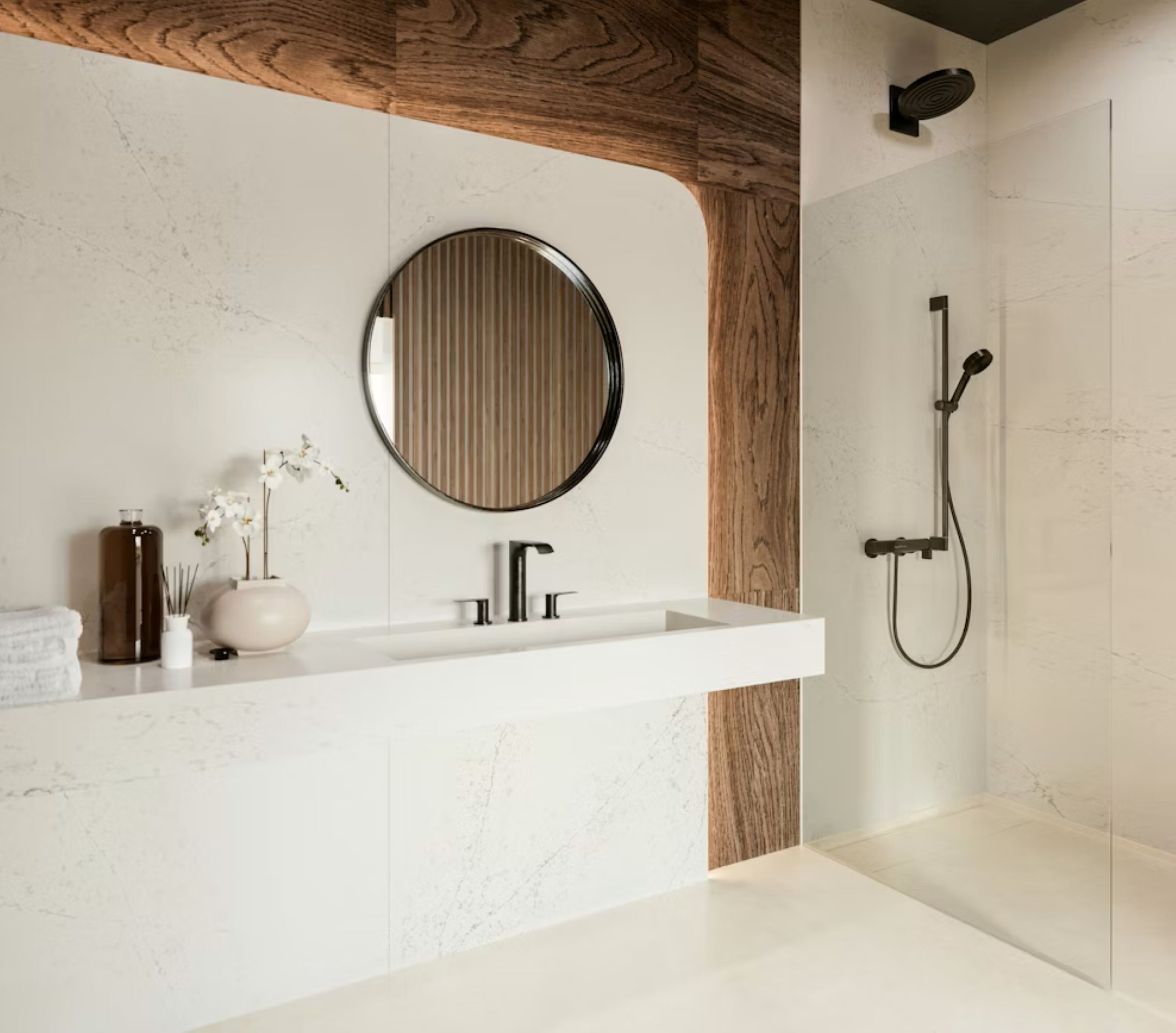 This colour reinterprets the classic Calacatta marble, bringing subtlety and elegance through a pattern of warm veins intertwined with grey veins.
